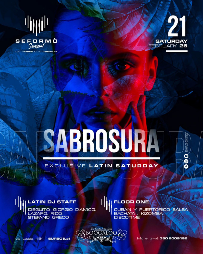 Sabato 21 febbraio 2026, il Boogaloo Discoteca riaccende i motori con "Sabrosura", l'appuntamento firmato Se Formรฒ Sensual, una notte concepita per celebrare l'essenza piรน autentica del clubbing latino, dove la musica e l'arte della miscelazione diventano protagoniste assolute.