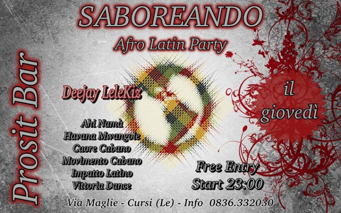 L'appuntamento infrasettimanale con la musica ? afrolatina ? è #saboreando...vi aspettiamo come sempre al Prosit Bar di Cursi, in compagnia delle scuole staff e di tantissimi bailadores da tutto il salento, dove oltre a ballare sulle selezioni curate da Deejay Lelekiz potrete gustare fantastici cocktail ed anche cenare con lo squisito servizio pizza & grill!!!